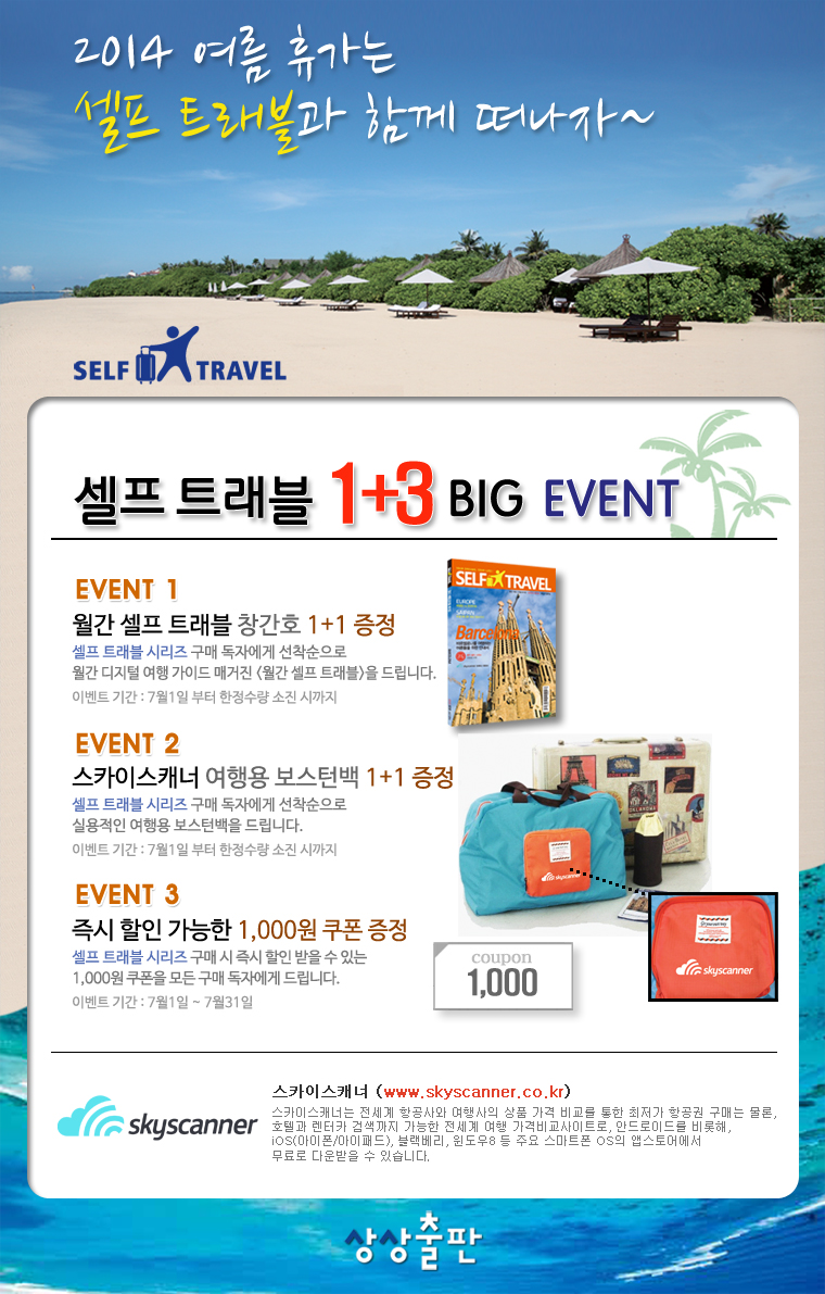 À̹ø À̺¥Æ®´Â ½ºÄ«À̽ºÄ³³Ê¿Í ¿©ÇàÀü¹® ÃâÆÇ»çÀÎ »ó»óÃâÆÇ(´ëÇ¥ À¯Ã¶»ó, www.esangsang.co.kr)ÀÌ º»°ÝÀûÀÎ ÈÞ°¡Ã¶À» ¾ÕµÎ°í °øµ¿À¸·Î ÁøÇàÇÏ´Â ¿©¸§ÈÞ°¡ ¸ÂÀÌ °í°´ Çà»ç·Î, ¼¿ÇÁ Æ®·¡ºí °¡À̵åºÏÀ» ±¸¸ÅÇÏ´Â °í°´¿¡°Ô ÃÑ 3°¡ÁöÀÇ ÇýÅÃÀÌ ÁÖ¾îÁø´Ù. ½ºÄ«À̽ºÄ³³Ê°¡ Á¦°øÇÏ´Â ¿©Çà¿ë °í±Þ º¸½ºÅϹéÀ» ºñ·ÔÇØ, ÃֽŠ¿©ÇàÁ¤º¸°¡ °í½º¶õÈ÷ ´ã±ä ¿ù°£ ¼¿ÇÁ Æ®·¡ºí ¸Å°ÅÁø, Áï½Ã ÇÒÀÎ °¡´ÉÇÑ 1,000¿ø ÄíÆùÀÌ ¼±Âø¼øÀ¸·Î Á¦°øµÈ´Ù.