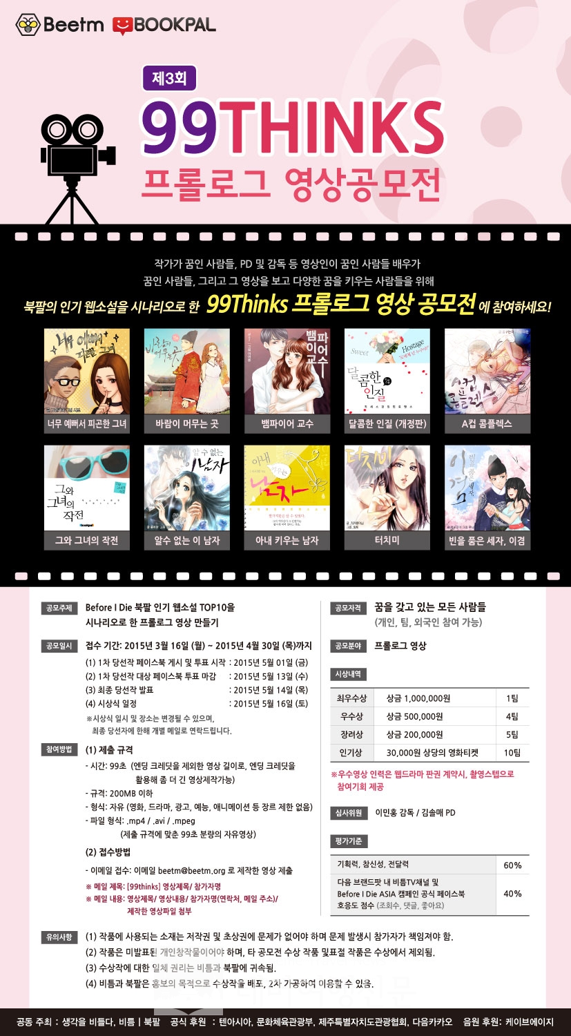 ¸ð¹ÙÀÏ À¥¼Ò¼³ ¾÷ü ºÏÆÈ°ú Before I Die ASIA Ä·ÆäÀÎÀÇ ÁÖ°ü»çÀÎ ºñÆ´ÀÌ ÁÖÃÖÇÏ´Â "99THINKS ÇÁ·Ñ·Î±× ¿µ»ó °ø¸ðÀü"¿¡ ´ëÇÑ °ü½ÉÀÌ ¶ß°Ì´Ù. 4¿ù 30ÀϱîÁö ÁøÇàµÇ´Â À̹ø °ø¸ðÀüÀº ºÏÆÈÀÇ Àαâ À¥¼Ò¼³ 10ÆíÀÇ ÇÁ·Ñ·Î±× ¿µ»óÀ» ¸¸µå´Â °ÍÀÌ °úÁ¦·Î ÁÖ¾îÁ® ÀÖÀ¸¸ç, ´Ù¾çÇÑ Çü½ÄÀ» ¾Æ¿ì¸¦ ¼ö ÀÖ´Ù.