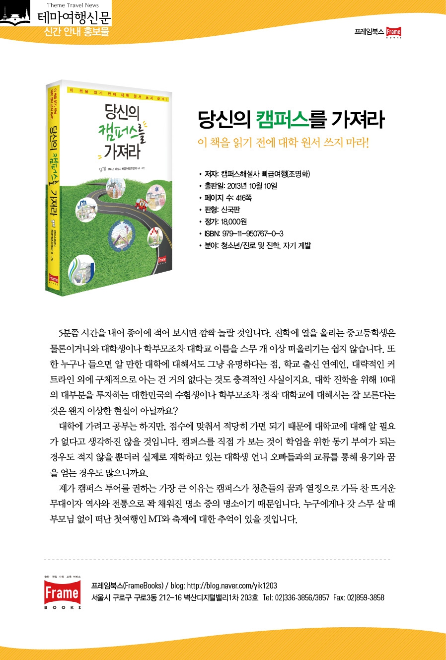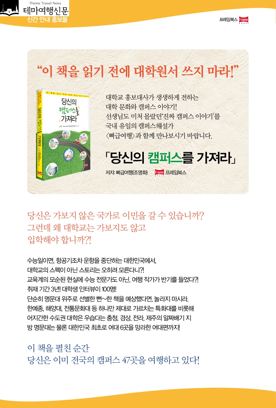 2010³â ´ëÇѹα¹ ÃÖÃÊÀÇ °ø¸ðÀü ¼¼°è¿©Çà±â ¡®Ä·ÆÛ½º ¹ÛÀ¸·Î Ç౺Ç϶ó(2010, ¼ºÇÏ)¡¯¸¦ Ãâ°£ÇØ ¡®°ø¸ðÀü ¿©Ç࡯À̶õ ½ÅÁ¶¾î¸¦ ź»ý½ÃÄ×´ø Á¶¸íÈ ÀÛ°¡(ÇÊ¸í »ß±Þ¿©Çà)ÀÌ 3³â¸¸¿¡ Ä·ÆÛ½º½Ã¸®Áî 2źÀ» Ãâ°£Çß´Ù. ù ¹øÂ° Àú¼¿¡¼ ´ëÇлý¿¡°Ô ÇØ¿ÜºÀ»ç, ´ëÇлý޹æ´Ü, ±¹Åä´ëÀåÁ¤ µî ´Ù¾çÇÑ °ø¸ðÀüÀ» ÅëÇØ ºñ¿ëÀº ³·Ãß°í ½Ç¸®´Â ì±â´Â ¿©Çà¹ýÀ» ¾È³»Çß´Ù¸é À̹ø Àú¼¿¡¼´Â Áß°íµîÇлý°ú Çкθ𸦠À§ÇÑ ¹Ì·¡¸¦ À§ÇÑ ±¹³» ¿©Çà¹ýÀ» °¡À̵åÇÑ´Ù. ¡®Ä·ÆÛ½º Åõ¾î¡¯´Â ¼öÇè»ýÀ» ´ë»óÀ¸·Î ½Ç½ÃµÇ´Â Àϼ± ´ëÇб³ÀÇ È«º¸ ÇÁ·Î±×·¥ÀÌ´Ù. Àϼ± Áß°íµîÇб³¿¡¼ ½Ç½ÃÇÏ´Â Ä·ÆÛ½º Åõ¾î´Â ÀçÇлýÀÇ ¿ä±¸¿¡ ¸Â´Â ´ëÇб³¸¦ ¼±º°Çؼ ÁøÇàÇϱ⺸´Ù´Â ¼¿ï´ë¸¦ ºñ·ÔÇÑ ¸î¸î ¸í¹®´ë¿¡ ÁýÁߵǴ °ÍÀÌ Çö½Ç. ´õ±¸³ª, Áö¹æ ¼ÒÀç ¼öÇè»ý¿¡°Õ ¼¿ïÀÇ ¸í¹®´ë¸¦ ¹æ¹®ÇÏ´Â °ÍÀº ¾ð°¨»ý½ÉÀϻӴõ·¯, Àü±¹ °¢Áö¿¡ ¼ÒÀçÇÑ Çѱ¹Çؾç´ë(ºÎ»ê), Çѱ¹±â¼ú±³À°´ëÇÐ(õ¾È), Ä«À̽ºÆ®(´ëÀü), Æ÷½ºÅØ(Æ÷Ç×), Çѱ¹ÀüÅ빮ȴë(ºÎ¿©) µîÀÇ Æ¯¼ö´ëÇÐÀº ¼öÇè»ýÀÌ È¥ÀÚ¼ ¹æ¹®ÇÏ´Â °ÍÀÌ ºÒ°¡´É¿¡ °¡±õ´Ù. ±¹³» ¿©ÇàÀÛ°¡ Áß À¯ÀÏÇÏ°Ô ¡®Ä·ÆÛ½ºÇؼ³»ç¡¯¶õ ŸÀÌÆ²·Î Ȱµ¿ÇÏ´Â Á¶¸íÈ ÀÛ°¡´Â ¼öÇè»ý°ú Çкθ𰡠Á÷¸éÇÑ ¾Æ½¬¿î Á¡À» ÇØ°áÇÒ ¼ö ÀÖ´Â ´ë¾ÈÀ» Á¦½ÃÇÑ´Ù. ¼¿ïºÎÅÍ Á¦ÁÖ±îÁö Àü±¹ 47°÷ÀÇ Ä·ÆÛ½º¸¦ Á÷Á¢ ¹æ¹®Çϰí, °¢ Çб³¸¦ ´ëÇ¥ÇÏ´Â È«º¸´ë»ç, Çлý ȸÀå µîÀ» ÀÎÅͺäÇØ¼ ¼Ò°³ÇÑ ¡®´ç½ÅÀÇ Ä·ÆÛ½º¸¦ °¡Á®¶ó¡¯°¡ ¹Ù·Î ±×°ÍÀÌ´Ù. ±âÁ¸¿¡ Ä·ÆÛ½º °ü·Ã ¼ÀûÀÌ ¸îÁ¾ ÀÖÀ¸³ª ÀϺÎÀÇ ¸í¹®´ë¸¦ ÁøÇÐ ¹æ¹ý À§ÁÖ·Î ´Ù·ç°í ÀÖ´Ù¸é, ÀÌ Ã¥Àº ¿©Çà¼ÀÇ ÄÁ¼ÁÀ¸·Î ±âȹµÇ¾î dzºÎÇÑ »çÁø°ú ÀçÇлýµéÀÇ »ýµ¿°¨ÀÖ´Â À̾߱⸦ Áß½ÉÀ¸·Î ÁýÇÊµÇ¾î ¼öÇè»ýµµ ºÎ´ã¾øÀÌ ÀÐÀ» ¼ö ÀÖ´Ù.