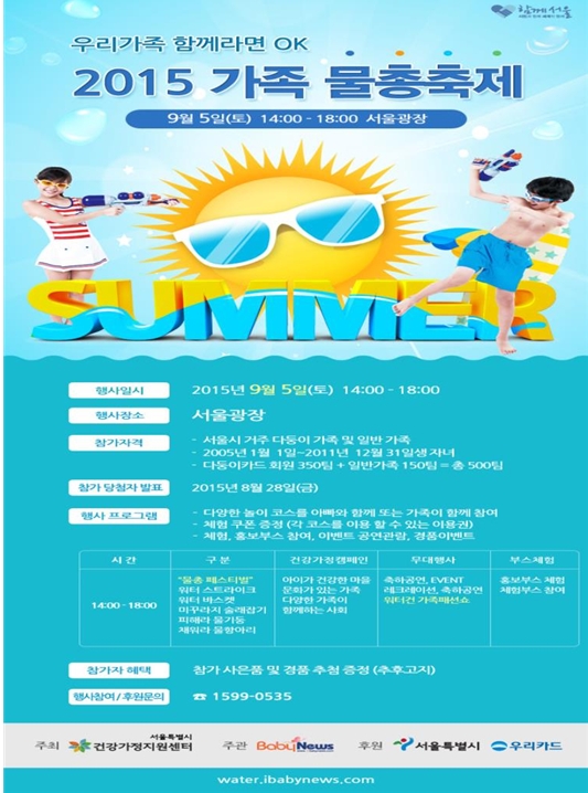 ¼¿ï½Ã´Â ¿À´Â 9¿ù 5ÀÏ, ¼¿ï±¤Àå¿¡¼ °¡Á·°ú ÇÔ²² ½Åü³îÀ̸¦ ÅëÇÏ¿© ºÎ¸ð-ÀÚ³à °£ ¼ÒÅëÀÇ ÀåÀ» ¸¶·ÃÇϰíÀÚ °³ÃֵǴ ¡®2015 °¡Á· ¹°ÃÑÃàÁ¦(¿ì¸®°¡Á· ÇÔ²²¶ó¸é OK!)¡¯ Âü°¡ÀÚ¸¦ Á¢¼öÇÑ´Ù. Âü°¡ Á¢¼ö´Â ¡®¹°ÃÑÃàÁ¦¡¯ ȨÆäÀÌÁö(http://water.ibabynews.com)¿¡¼ ÁøÇàÇϸç, ½ÅûÇÑ °¡Á· Áß 500°¡Á·À» Ãß÷ ¼±¹ßÇØ ÃÖÁ¾ Âü°¡ÀÚ·Î °áÁ¤ÇÑ´Ù. Âü°¡ÀÚ°ÝÀº ¼¿ï½Ã¿¡ °ÅÁÖÇÏ´Â ¸¸4~10¼¼ ÀÌÇÏ ÀÚ³à(2005³â 1¿ù1ÀÏ~ 2011³â 12¿ù 31ÀÏ»ý ÀÚ³à)¸¦ °¡Áø °¡Á·ÀÌ¸é ½Åû °¡´ÉÇÏ´Ù. Âü°¡ Á¢¼ö´Â 8¿ù 27ÀÏ(¸ñ)±îÁö·Î, ÃÖÁ¾ Âü°¡ÀÚ´Â 8¿ù 28ÀÏ(±Ý) ȨÆäÀÌÁö¸¦ ÅëÇØ ¹ßÇ¥ÇÑ´Ù.