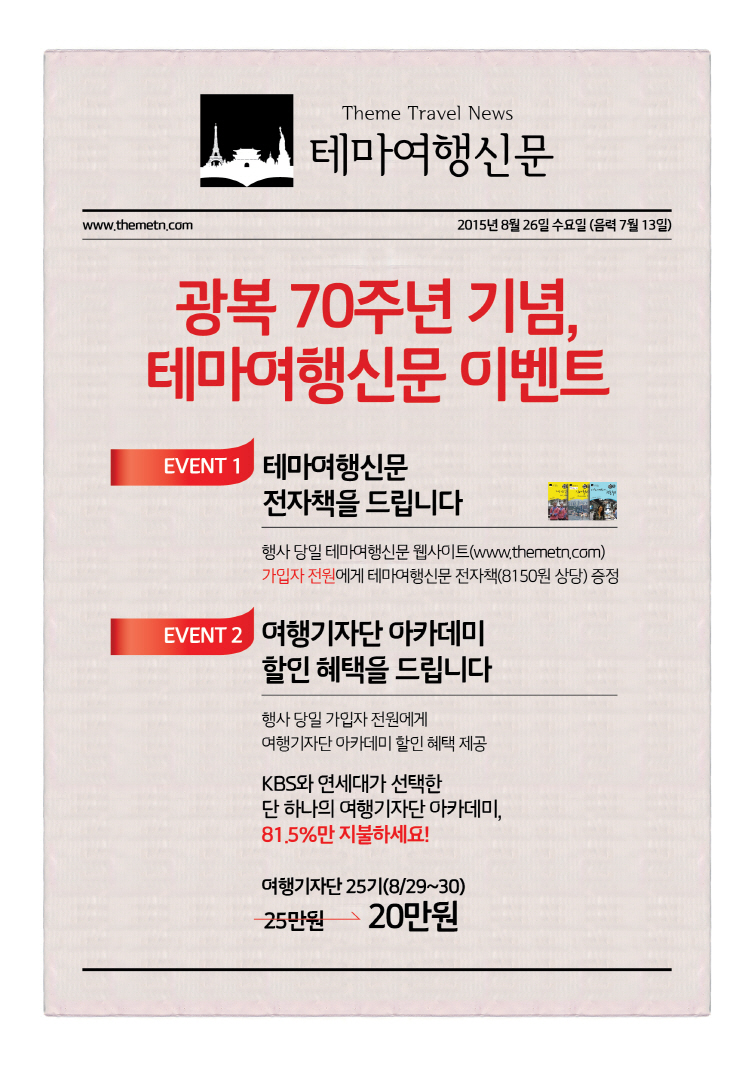 ¿©Çà Àü¹® ÀüÀÚÃâÆÇ»ç Å׸¶¿©Çà½Å¹® TTN(Á¶¸íÈ ÆíÁýÀå, http://themetn.com)ÀÌ 8¿ù 26ÀÏ ±¤º¹ 70Áֳ⠱â³ä 815 À̺¥Æ®¸¦ °³ÃÖÇÑ´Ù. Å׸¶¿©Çà½Å¹®Àº 2014 ¼¼°è ÃÖ´ëÀÇ ÄÜÅÙÃ÷¹Ú¶÷ȸ ¹Ì±¹ SXSW, ¾Æ½Ã¾Æ ÃÖ´ë ½ºÅ¸Æ®¾÷ ÄÁÆÛ·±½º 2014 ºñ·ÐÄ¡, GSC µî¿¡ Âü°¡ÇÑ ¡®±Û·Î¹ú ¿©ÇàÄÜÅÙÃ÷Ç÷§Æû¡¯À¸·Î½á ¡®K-èÇÁ ÆË¾÷½ºÅä¾î¡¯¸¦ ÅëÇØ °ü¶÷°´¿¡°Ô ÀÚ»çÀÇ 130¿©Á¾¿¡ ´ÞÇÏ´Â ¿©ÇàÄÜÅÙÃ÷¸¦ ¼Ò°³ÇÒ ¿¹Á¤ÀÌ´Ù. ¶ÇÇÑ Çà»ç ´çÀÏ À¥»çÀÌÆ®¿¡ °¡ÀÔÇÑ Àü¿ø¿¡°Ô 8,150¿ø »ó´çÀÇ ÀüÀÚÃ¥À» ·£´ý ÁõÁ¤Çϰí 8¿ù ¿©Çà±âÀÚ´Ü ¾ÆÄ«µ¥¹Ì ÇÒÀÎ ÇýÅÃÀ» Á¦°øÇÑ´Ù.