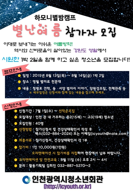 ÀÎõ±¤¿ª½Ã û¼Ò³âȸ°ü(°üÀå ±è°æ¹Ì)¿¡¼´Â ¿©¸§¹æÇÐÀ» ¸Â¾Æ 8¿ù 13ÀÏ ºÎÅÍ 8¿ù 14ÀϱîÁö 1¹Ú2ÀÏ µ¿¾È Çϸð´Ïº°¹ãÄ·ÇÁ ¡®º°³¿©¸§¡¯À» ¿î¿µÇÑ´Ù.