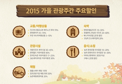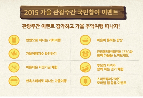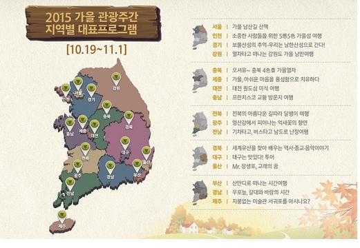 ¹®ÈüÀ°°ü±¤ºÎ(Àå°ü ±èÁ¾´ö, ÀÌÇÏ ¹®Ã¼ºÎ)´Â 10¿ù 19ÀÏ(¿ù)ºÎÅÍ 11¿ù 1ÀÏ(ÀÏ)±îÁö Çѱ¹°ü±¤°ø»ç¿Í Áö¹æÀÚÄ¡´Üü, °ø°ø±â°ü ¹× ±â¾÷°ú ÇÔ²² ¡®¶°³ª¼¼¿ä, °¡À»Àº ªÁö¸¸ °¡À»ÀÇ Ãß¾ïÀº ±é´Ï´Ù¡¯¶ó´Â Ç¥¾î·Î ¡®2015 °¡À» °ü±¤ÁÖ°£¡¯À» ½ÃÇàÇÑ´Ù. À̹ø °¡À» °ü±¤ÁÖ°£¿¡´Â ±¤¿ª ÁöÀÚü¸¦ ´ë»óÀ¸·Î °ø¸ð¸¦ ÅëÇØ ¼±Á¤ÇÑ 17°³ÀÇ ´ëÇ¥ ÇÁ·Î±×·¥ÀÌ ¿î¿µµÇ¸ç, Àü±¹ÀûÀ¸·Î 3,500¿© °³ÀÇ ¾÷¼Ò¿¡¼ ´Ù¾çÇÑ ÇÒÀÎÀÌ ÁøÇàµÈ´Ù. ¶ÇÇÑ, ÀÏ¹Ý ¿©Çà»ç°¡ ÁغñÇÑ °¡À» ¿©Çà»óǰ Áß 17°³ÀÇ ¿ì¼ö¿©Çà»óǰÀ» ¼±Á¤ÇÏ¿© ±¹¹Îµé¿¡°Ô ¼Ò°³Çϰí, 1¹Ú 2ÀÏÀÇ ¾Ë¶ã¿©ÇàÄÚ½º 20¼±À» ¼±º¸ÀÌ´Â µî, ±¹¹ÎµéÀÌ ´ëÇѹα¹ ±¸¼®±¸¼®À» ´õ¿í ¾ËÂ÷°Ô ¿©ÇàÇÏ¸ç ±¹³»¿©ÇàÀÇ ¸Å·ÂÀ» ´À³¥ ¼ö ÀÖµµ·Ï ´Ù¾çÇÑ Á¤º¸µµ Á¦°øÇÒ °èȹÀÌ´Ù. À̿ܿ¡µµ ¼ÒÁßÇÑ »ç¶÷µé°ú ÇÔ²² °¡À» Ã߾←ÇàÀ» ¶°³¯ ¼ö ÀÖµµ·Ï ÇÏ´Â 8°³ÀÇ ±¹¹Î Âü¿© À̺¥Æ®, Áß¼Ò¡¤Áß°ß ±â¾÷ ±Ù·ÎÀÚµéÀÇ ÈÞ°¡ Áö¿øÀ» À§ÇÑ À̺¥Æ®, Àå¾ÖÀÎÀ̳ª µµ¼ Áö¿ª û¼Ò³â µî °ü±¤¼Ò¿Ü°èÃþÀÇ °ü±¤ ÇâÀ¯±Ç È®´ë¸¦ À§ÇÑ ³ª´® ¿©Ç൵ ÁøÇàÇÒ ¿¹Á¤ÀÌ´Ù.