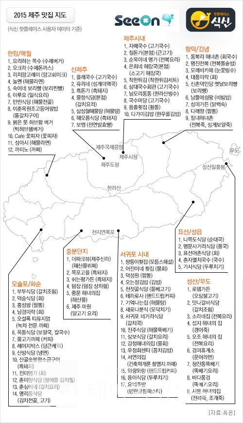 À§Ä¡±â¹ÝSNS Àü¹®±â¾÷ ¾¾¿Â(www.seeon.kr, ´ëÇ¥ ¾Èº´ÀÍ)ÀÌ 2ÀÏ »ç¿ëÀÚ Âü¿©Çü ¸ÀÁý Ãßõ ¼ºñ½ºÀÎ ¡®½Ä½Å ÇÖÇ÷¹À̽º¡¯¸¦ »ç¿ëÇÏ´Â 100¸¸ »ç¿ëÀÚÀÇ Ã¼Å©ÀÎ, ¸®ºä, ½ºÅ©·¦ µîÀÇ µ¥ÀÌÅÍ Åë°è¸¦ Ȱ¿ëÇØ 2015³â Á¦ÁÖ ÁÖ¿ä Áö¿ª ¸ÀÁý Áöµµ¸¦ °ø°³Çß´Ù.