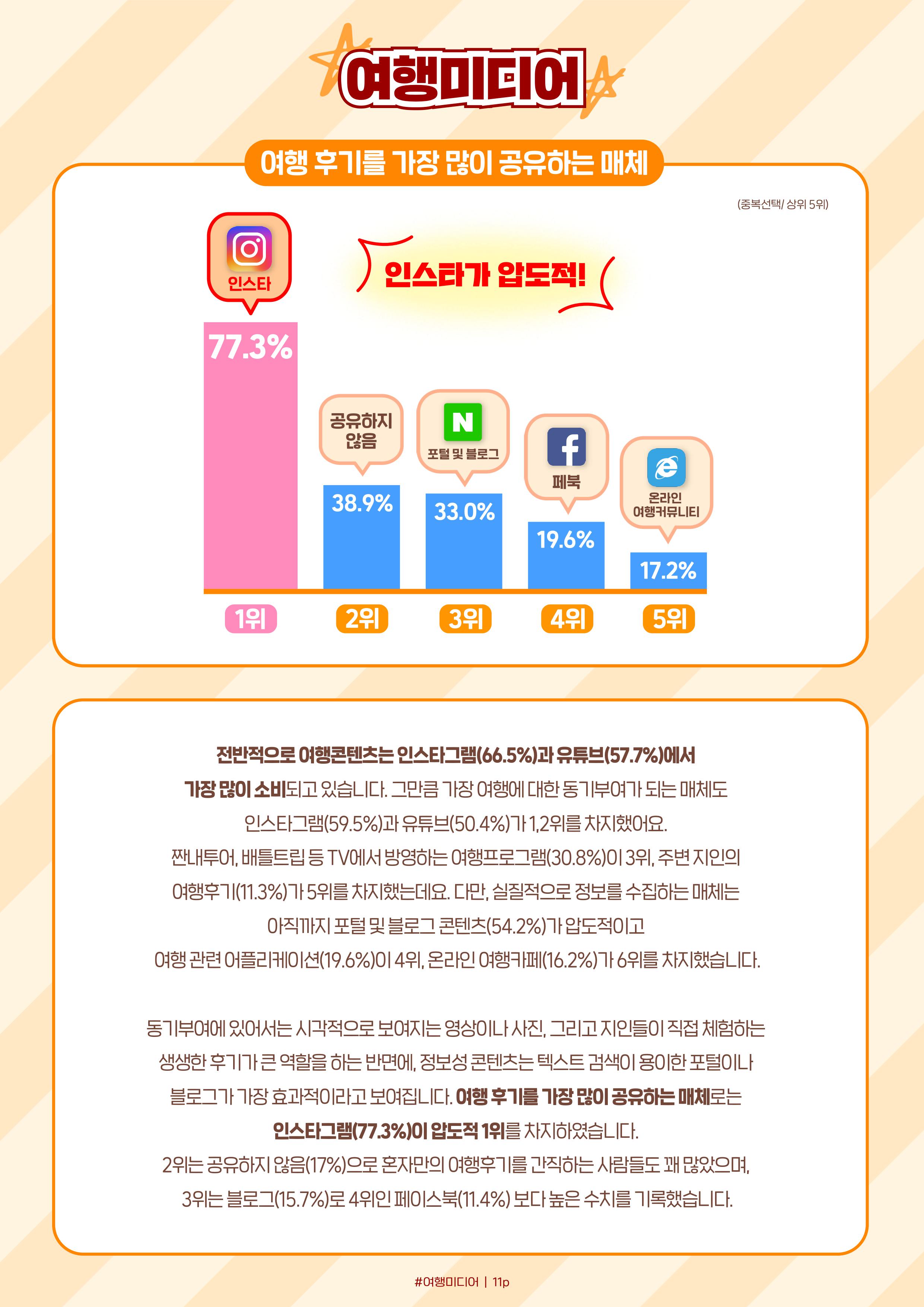 ¶ÇÇÑ, ÀνºÅ¸±×·¥(66.5%)°ú À¯Æ©ºê(57.7%)¿¡¼ ¿©Çà ÄÜÅÙÃ÷¸¦ ÁÖ·Î Á¢ÇÏ´Â °ÍÀ¸·Î ³ªÅ¸³µÀ¸¸ç, °¡Àå ¿©ÇàÀÇ µ¿±âºÎ¿©¸¦ ¾ò´Â ¸Åü ¿ª½Ã ÀνºÅ¸±×·¥(59.5%)°ú À¯Æ©ºê(50.4%)·Î ³ªÅ¸³µ´Ù. ´Ù¸¸, ½ÇÁúÀûÀÎ ¿©Çà Á¤º¸¸¦ ¼öÁýÇÏ´Â ¸Åü´Â ¾ÆÁ÷±îÁö Æ÷ÅÐ ¹× ºí·Î±× ÄÜÅÙÃ÷(54.2%)ÀÎ °ÍÀ¸·Î ³ªÅ¸³µÀ¸¸ç, °³ÀÎÀÇ ¿©ÇàÈı⸦ °øÀ¯ÇÏ´Â ¸Åü·Î´Â ÀνºÅ¸±×·¥(77.3%)ÀÌ °¡Àå ÀαⰡ ÀÖ¾ú´Ù. Ç×°øÀ» ¼±ÅÃÇÒ ¶§ °¡Àå °í·ÁÇÏ´Â ¿ä¼Ò´Â ºñ¿ë(71.3%)ÀÌ ´ëºÎºÐÀ̾úÀ¸³ª ¼÷¹ÚÀ» ¼±ÅÃÇÒ ¶§ °¡Àå °í·ÁÇÏ´Â ¿ä¼Ò·Î´Â À§Ä¡(32.6%), ÈÄ±â ¹× ÆòÁ¡(29.8%), °´½Ç»óÅÂ(19.3%) µîÀ¸·Î ´Ù¾çÇß´Ù. ÁÖ·Î ÀÌ¿ëÇÏ´Â »çÀÌÆ® ¿ª½Ã Ç×°ø ¿¹¾à¿¡¼´Â °¡°ÝÀ» Áß½ÉÀ¸·Î ºñ±³°¡ °¡´ÉÇÑ ½ºÄ«À̽ºÄ³³Ê(67.3%)°¡ ÀαⰡ ÀÖ´Â ¹Ý¸é, ¼÷¹Ú ¿¹¾à¿¡¼´Â ¿¡¾îºñ¾Øºñ(60.7%)¿Í ¾Æ°í´Ù(60.3%)ÀÇ ¼±È£µµ°¡ ³ô¾Ò´Ù.