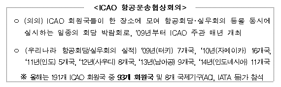 Á¤ºÎ ´ëÇ¥´Ü(¿Ü±³ºÎ‧±¹Åä±³ÅëºÎ ÇÕµ¿)Àº Á¦8Â÷ ±¹Á¦¹Î°£Ç×°ø±â±¸ Ç×°ø¿î¼ÛÇù»óȸÀÇ('15.10.19-23, ÅÍŰ)¿¡ Âü¼®ÇÏ¿©, 8°³ ±¹°¡¿Í ¿¬¼ÓÀûÀÎ ¾çÀÚ Ç×°øÈ¸´ãÀ» ÅëÇØ ÇϴñæÀ» ³ÐÈ÷´Â °á°ú¸¦ µµÃâÇÏ¿´´Ù. ƯÈ÷, ÇÑ-¿À½ºÆ®¸®¾Æ Ç×°øÈ¸´ã¿¡¼´Â Ç×°øÇùÁ¤ Àü¸é °³Á¤À» À§ÇÑ ½Å±Ô ¹®¾È¿¡ ÇÕÀÇ ¹× °¡¼¸íÇÏ¿´À¸¸ç, Á÷Ç׳뼱 °ø±Þ·Â ÀÚÀ¯È¿¡ ÇÕÀÇÇÏ¿´´Ù. Ç×°ø»ç°¡ ¿îÇ×Ƚ¼ö Á¦ÇѾøÀÌ ÀÚÀ¯·Ó°Ô ¿îÇ×ÇÒ ¼ö ÀÖ´Â ±â¹ÝÀ» ¸¶·ÃÇÔÀ¸·Î½á, À¯·´¿¡¼´Â ½ºÆäÀο¡ À̾î 2¹øÂ°·Î °ø±Þ·Â ÀÚÀ¯È°¡ ÀÌ·ç¾îÁö´Â µî ¿ì¸® Ç×°ø»çÀÇ À¯·´ Ç×°ø½ÃÀå ÁøÃâÀÌ ´õ¿í °¡¼Ó鵃 °ÍÀ¸·Î Àü¸ÁµÈ´Ù. ±âÁ¸ ÇÑ-¿À½ºÆ®¸®¾Æ°£¿¡´Â ÁÖ4ȸ·Î Á¦ÇѵǾî ÇöÀç ´ëÇÑÇ×°ø¸¸ ¿îÇ×(ÁÖ3ȸ, ÀÎõ/ºñ¿£³ª)Çß´Ù. ¶ÇÇÑ, ¼¼°è 3´ë ÆøÆ÷ Áß ÇϳªÀÎ ºòÅ丮¾Æ ÆøÆ÷·Î À¯¸íÇÑ ¾ÆÇÁ¸®Ä« Áü¹Ùºê¿þ¿ÍÀÇ Ç×°øÈ¸´ã °³ÃÖ¸¦ ÅëÇØ Ç×°øÇùÁ¤ ½Å±Ô ü°áÀ» À§ÇÑ ¹®¾È¿¡ °¡¼¸íÇϰí, Á÷Ç׳뼱 °ø±Þ·ÂÀ» ÁÖ3ȸ±îÁö ¿îÇ×ÇÒ ¼ö ÀÖµµ·Ï ÇÕÀÇÇÔÀ¸·Î½á ¾ÆÇÁ¸®Ä« ´ë·úÀÇ ±¹Á¦Ç×°ø ³×Æ®¿öÅ©°¡ È®´ëµÇ¾ú´Ù.